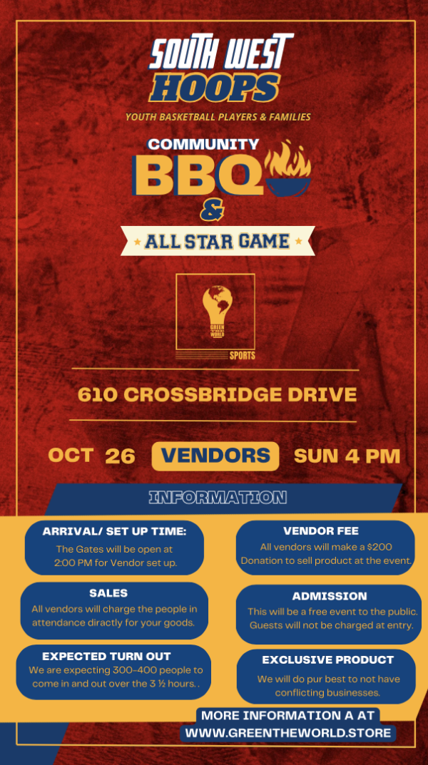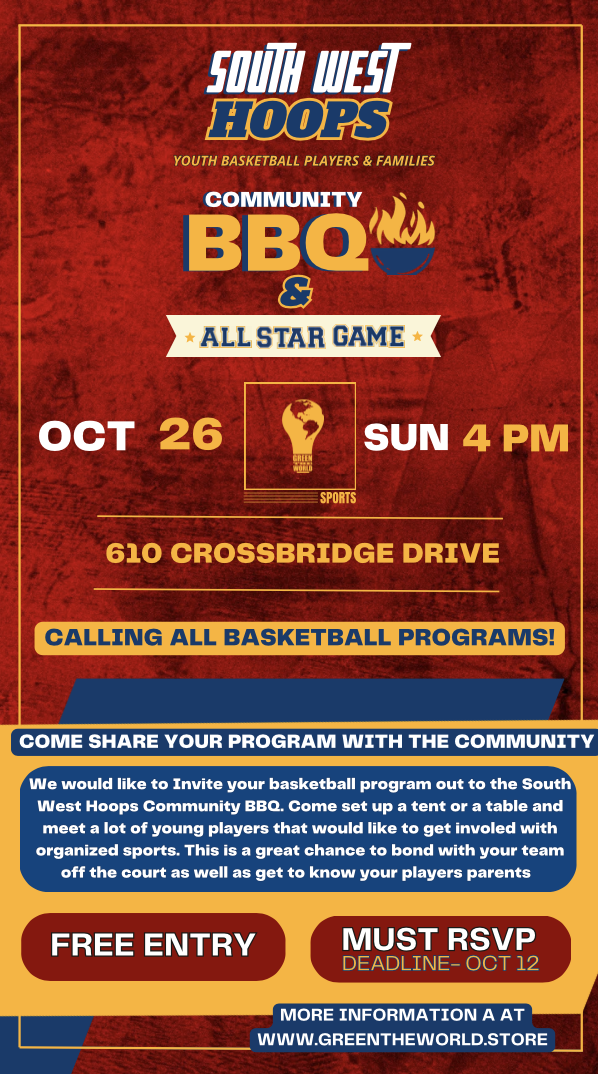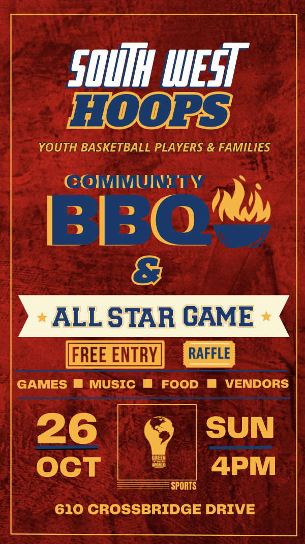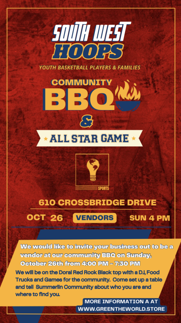 Sunday October 26, 2025 we are bringing The Second SouthWest Hoops Community BBQ & All Star Game to the Las Vegas Summerlin community. This Event is for the athletes, basketball teams, families, and local business that are in support of community sports. Come join us for a night of great energy and wholesome connectivity. Come watch the South West Hoops All Star Game, have some great food, Listen to some great music and enjoy some great company with us.