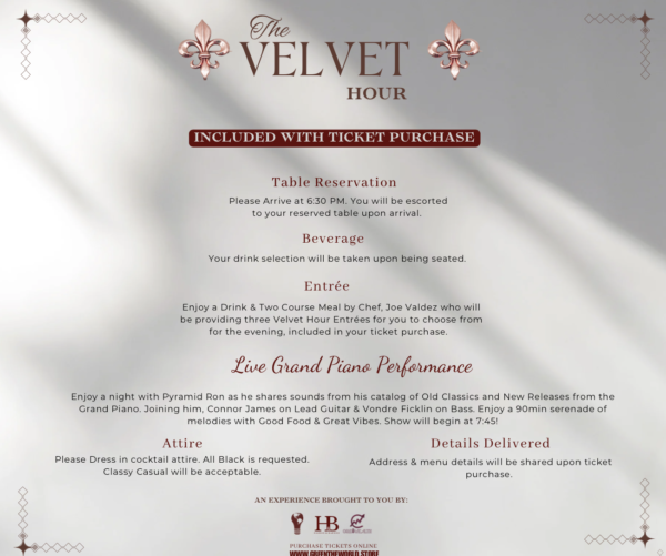 This is the dinner event of the year. Come enjoy a live Grand Piano Performance by Pyramid Ron. Chef Jose Valdez will be providing entrée options included with your ticket purchase.