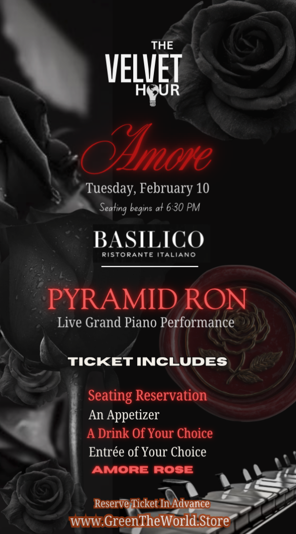 This is the Valentines & Galentines dinner event of the year. Come enjoy a live Grand Piano Performance by Pyramid Ron. Chef Jose Valdez will be providing entrée options included with “Indoor seating” and “Amore Package” ticket purchase.